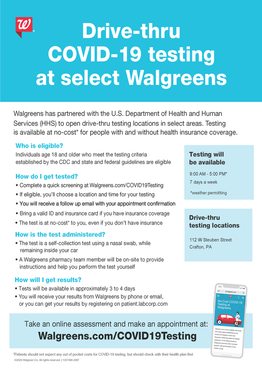 Wayne D Fontana On Twitter Drive Thru Covid 19 Testing Starts Today At Walgreens In Crafton Boro Located At 112 W Steuben St Https T Co Vi9xxjq4n1 Https T Co Lj1hewjwd3 Twitter